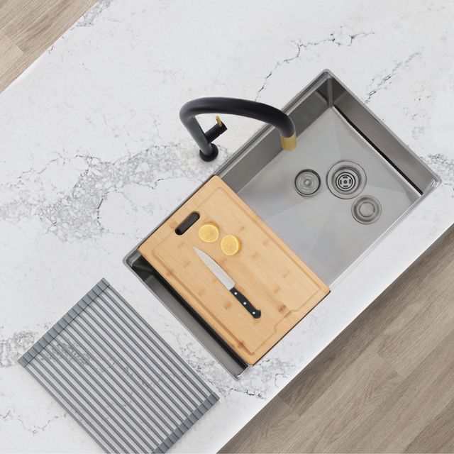 Create a sophisticated kitchen look with our AZUNI Sinks. Featuring this 30″ x 19″ x 10” Undermount Kitchen Sink. This?workstation?kitchen sink combines the best of both world: a bold stainless-steel single bowl sink with a functional workstation: built-in accessories that slide on the integrated tracks in the sink. This stainless-steel kitchen sink includes one luxury basket strainer, one drying rack, one bamboo cutting board and one bottom grid made of 100% stainless steel which will really help to protect your sink from dents or scratches. Handcrafted using premium 304 stainless steel with 16 gauge and 18/10 chrome/nickel content and featuring a refined brushed finished.