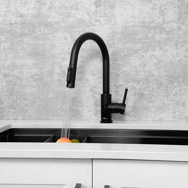 The Modena pull-down faucet seamlessly blends style and functionality, featuring an integrated water filtration system. Made from 100% stainless steel, it enhances any modern kitchen.